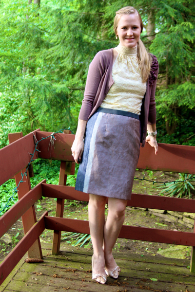 I just got this skirt from the LOFT this weekend. It was way on sale! So now I'm going to have to find some new and fun ways to style it. I always go with the easiest (most obvious) way first. For some reason, my brain needs to go through a process to find the more interesting ideas that come later.