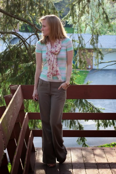 It is no secret that I love my bird prints. This scarf is a fun one to wear, and - bonus - it is light weight and perfect for summer. The pinks play nicely with the minty stripes. I love it when my clothes play together!